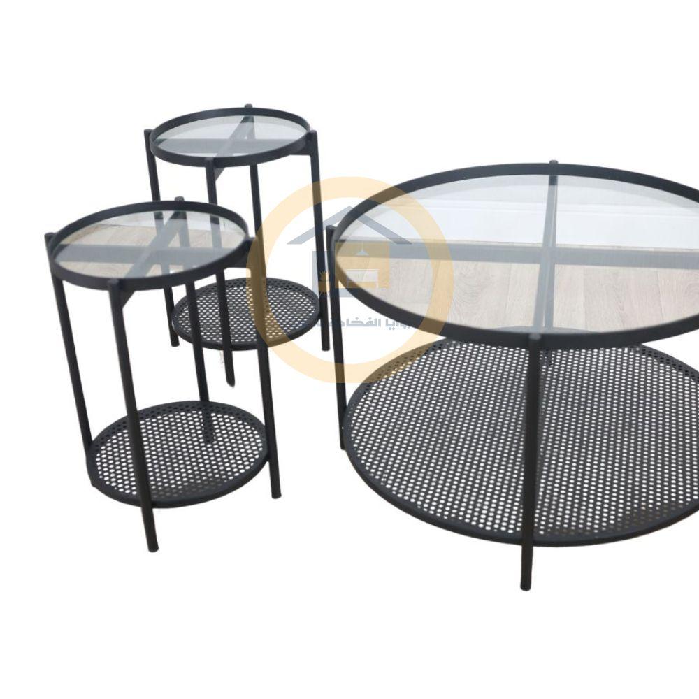 - طقم طاولة قهوة عصري يتألف من طاولة كبيرة دائرية ذات دورين و 4 طاولات خدمة صغيرة.