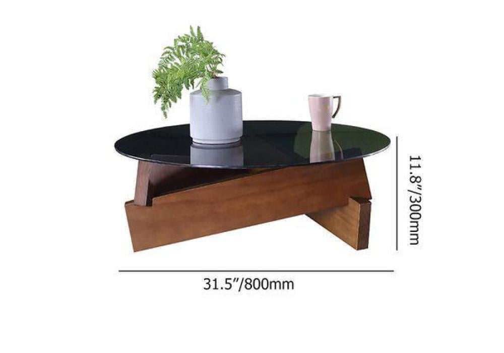 - طاولة قهوة بتصميم دائري مع قاعدة خشبية هندسية مميزة.