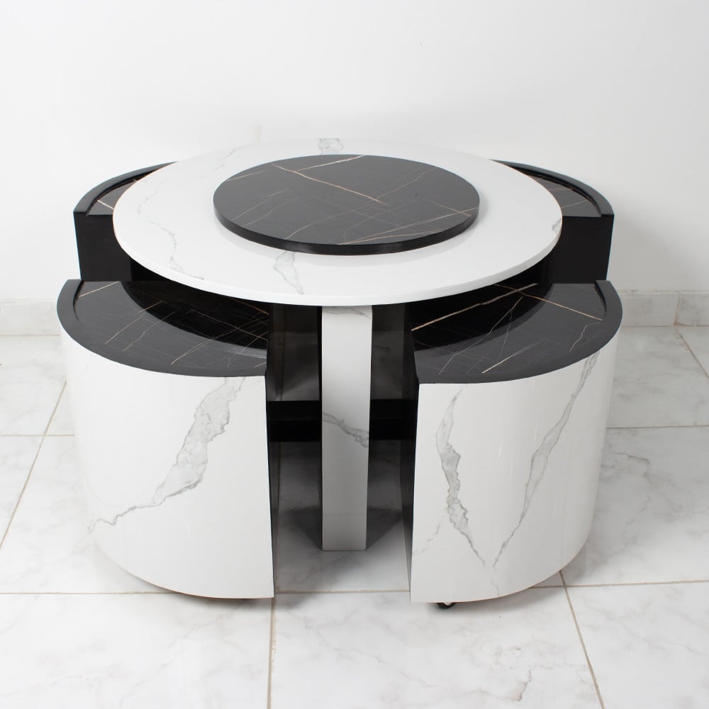 - سطح الطاولة الرئيسية من الرخام الأبيض مع سطح دوار أسود من الرخام أيضًا.